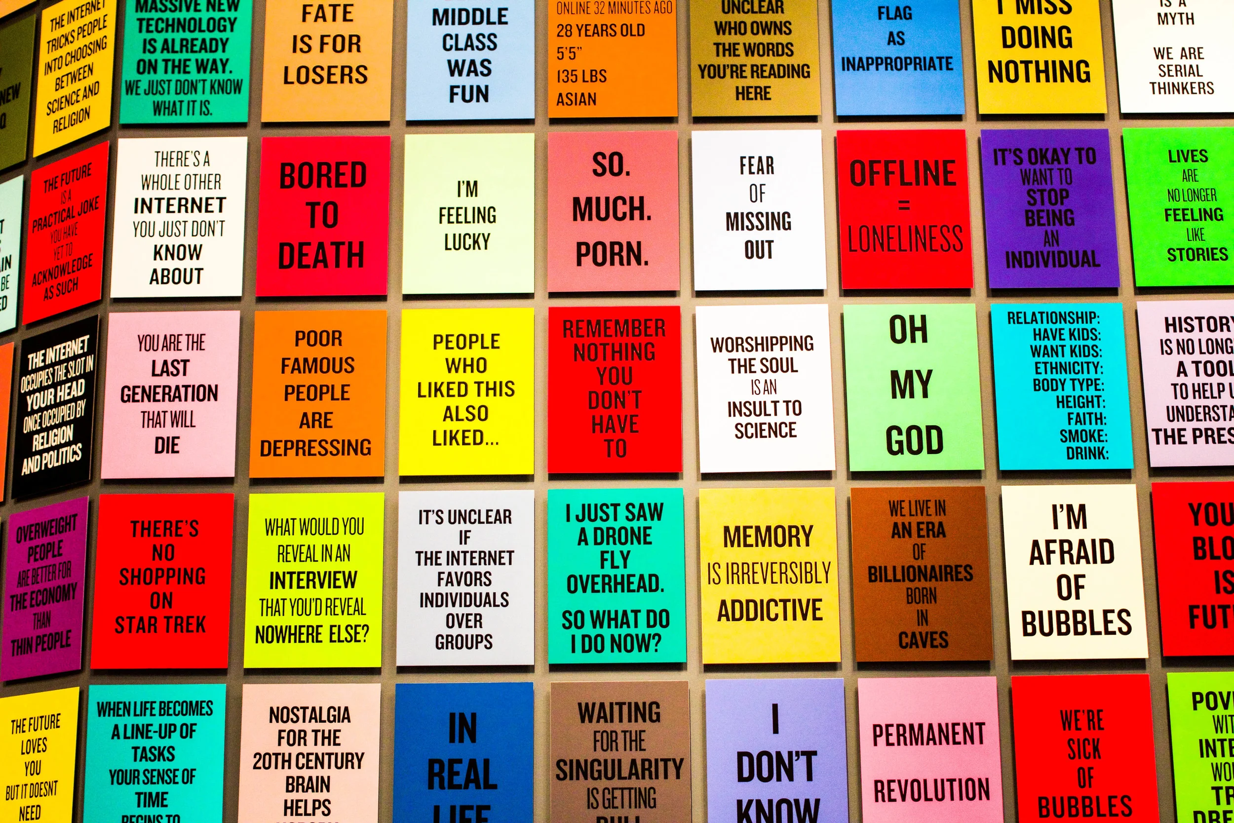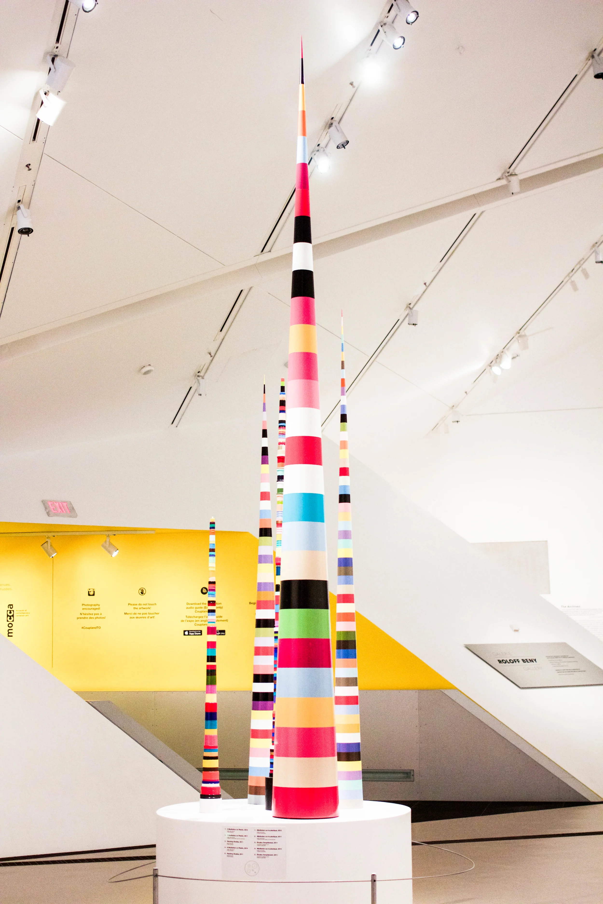 The MOCCA exhibition was based around the notion of Canadiana and Canadian cultural identity, while the exhibition at the ROM featured much larger works that discussed 21st century technology, popular culture, and the influence of social media on our world today. Unlike the majority of art exhibitions, visitors were encouraged to use their phones to take pictures and engage in social media, a phenomenon in which Coupland has commented, "I don’t think its possible to have people not take photos... people are just strip mining museums for Instagram and wallpaper and stuff, which is kind of funny actually because it gets people involved”.